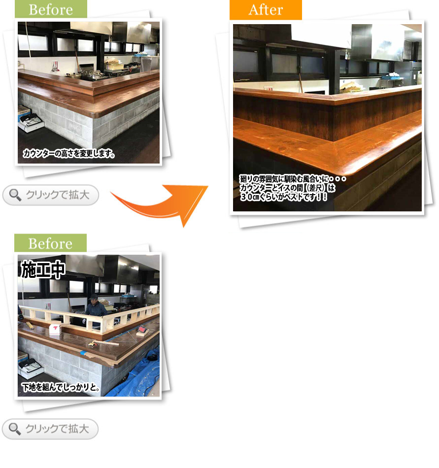 今回工事を依頼したのは、ラーメン店を開店するにあたって、気になるカウンターの工事を依頼する業者さんを探しておりました。そこでホームページで検索してみると地元で工事件数もこなしており、なおかつ面白そうだと思ったので一度見に来ていただく事にしました、すると担当者さんのツバタさんも人当たりが良く、見積もり、工事日程合わせもすんなりと行きご依頼する事にしました。完了後も見た目もよく大変満足しております。