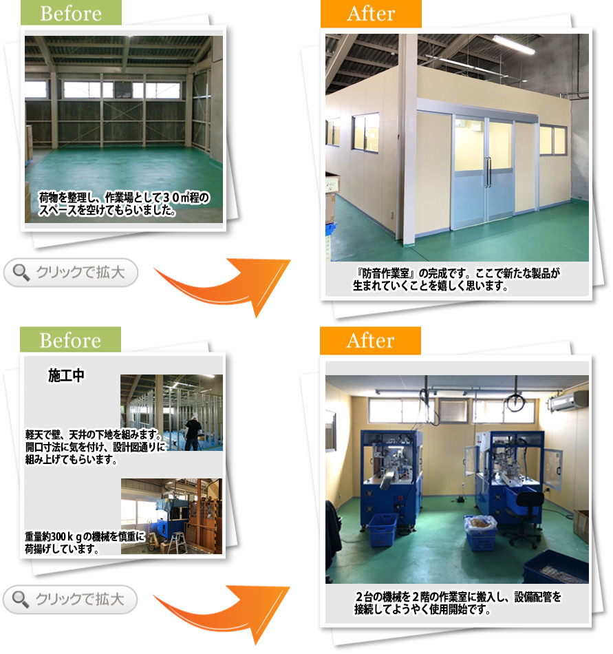 通常業務を行う中で工事をお願いしたところ、搬入や騒音にも気を遣ってくださり、たいへん助かりました。また大きな機械の荷揚げもスムーズに行ってくださいました。設置いただいた作業室はエアコンの効きも良く、快適に作業が行えるのでたいへん喜んでおります。