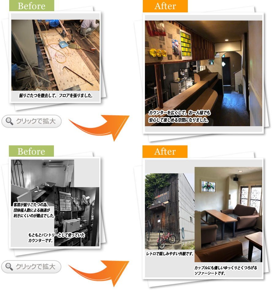石山駅から国道1号線に入る信号近くにあるCOCHIYAさん。ダイニングバーとして地域の皆様に愛されたお店が、より安全に快適な空間へと生まれ変わりました。一人でも安心して飲めるバーカウンター席を増設し、床の段差も解消しました。また掘りごたつからテーブル席へと改装したことで、靴を脱がなくても良い、女性には嬉しい落ち着いた空間となりました。若者カップルから、仕事帰りのサラリーマンまで幅広く楽しめるダイニングバーとして、これからも愛される場所となる事を願っています。