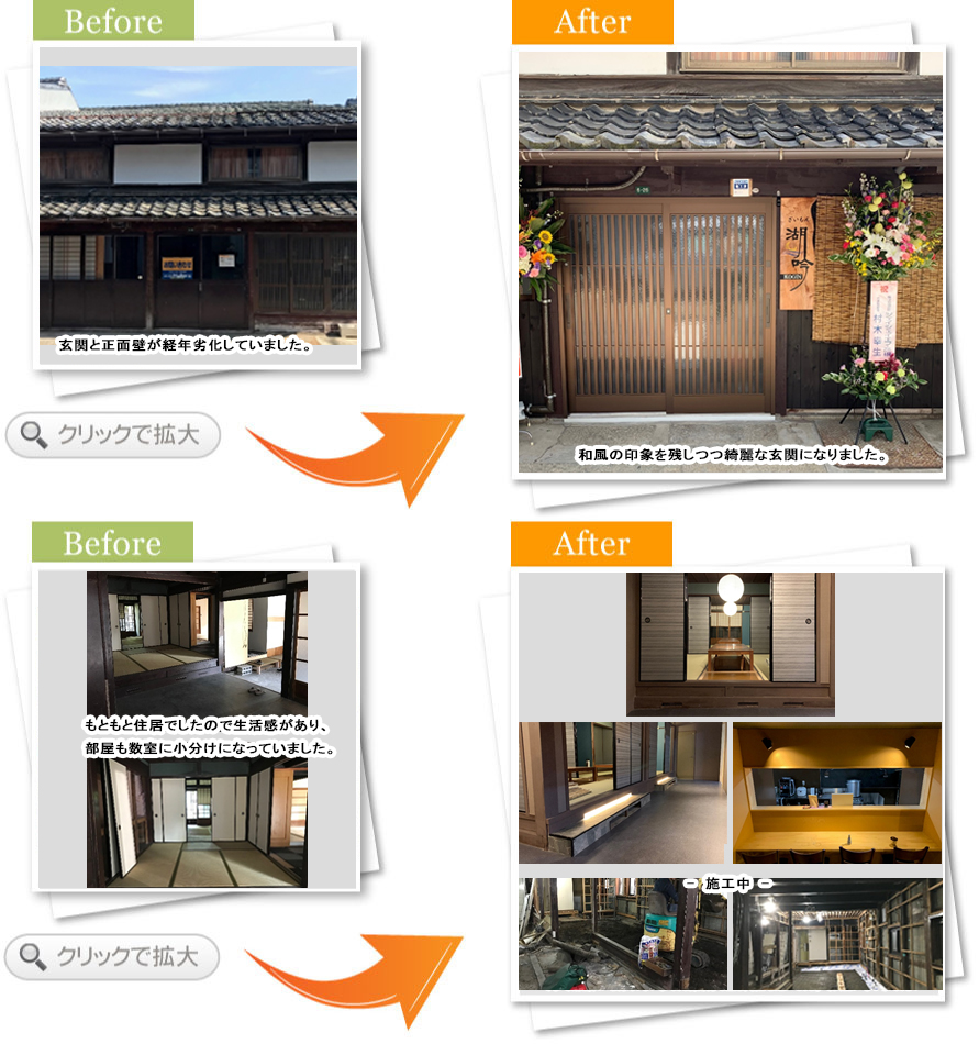 今回、古民家から改装し居酒屋さんの店舗にするという、私自身ワクワクする工事をご依頼頂きました。工事中もお客様と打合せを交わしながら、ご希望に添えるよう施工を進めました。
