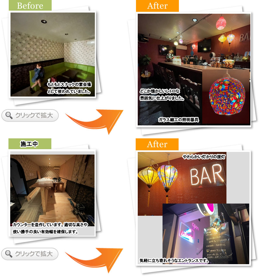 完了後アンケート以前は、スナックの宴会場として使われていたお店を、新しくBARとしてオープンいたしました。一番のコダワリでもあるカウンターを、専門的なアドバイスで綺麗に使い勝手の良いように仕上げてくださいました。また各法令にも配慮し、消防設備や保健所の申請も手際よく行ってくださいました。そして予算内で納めるためにいろんな工夫とアドバイスをしてくださり、とても助かりました。