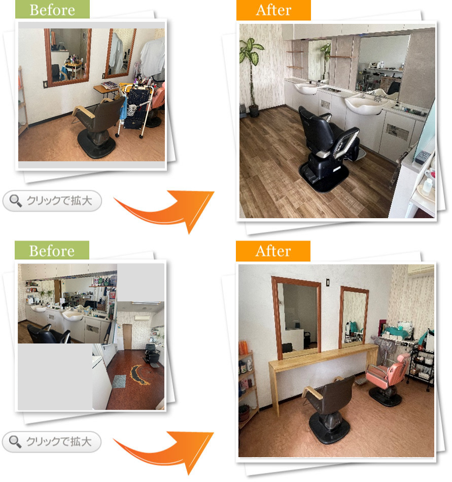完了後アンケート理容の床、鏡が古くなりイメージチェンジをしたく、美容の方は鏡前にカウンターをつけて雑誌等が置けるように、周りの雰囲気も合わせて変えていきたく工事をお願いしました。