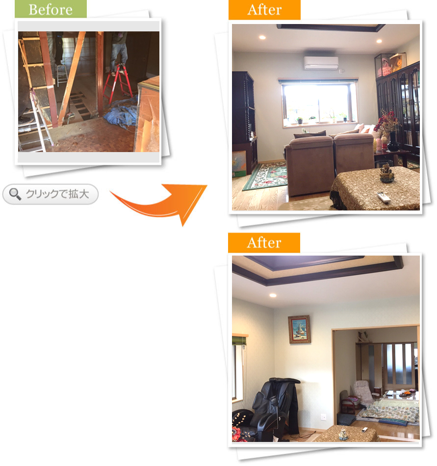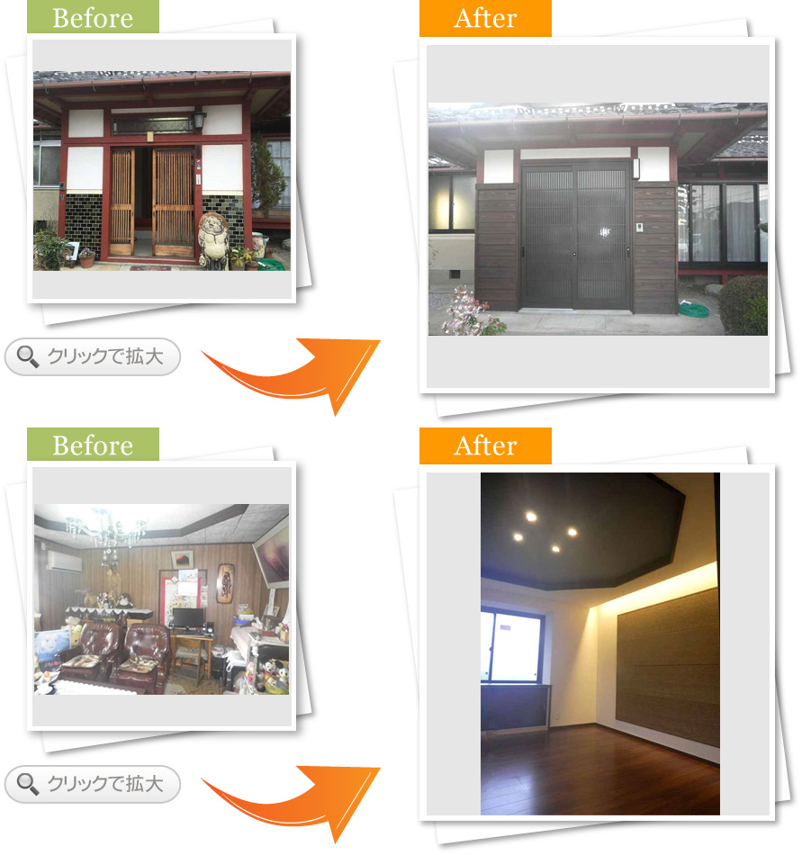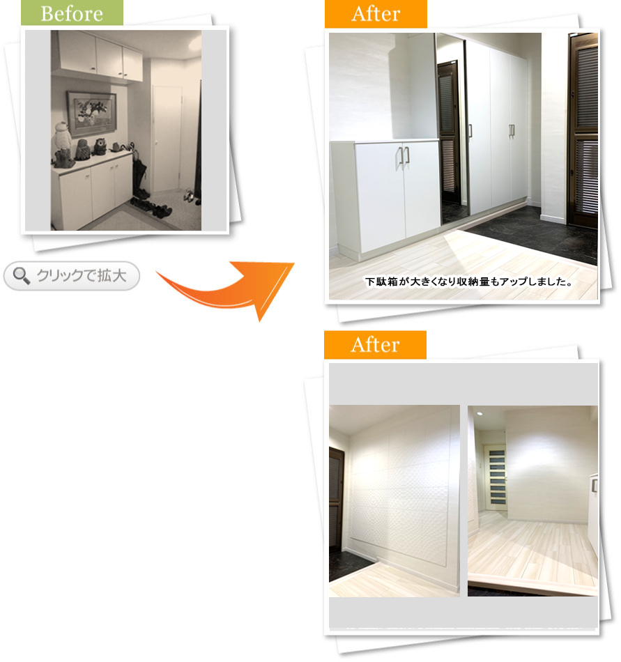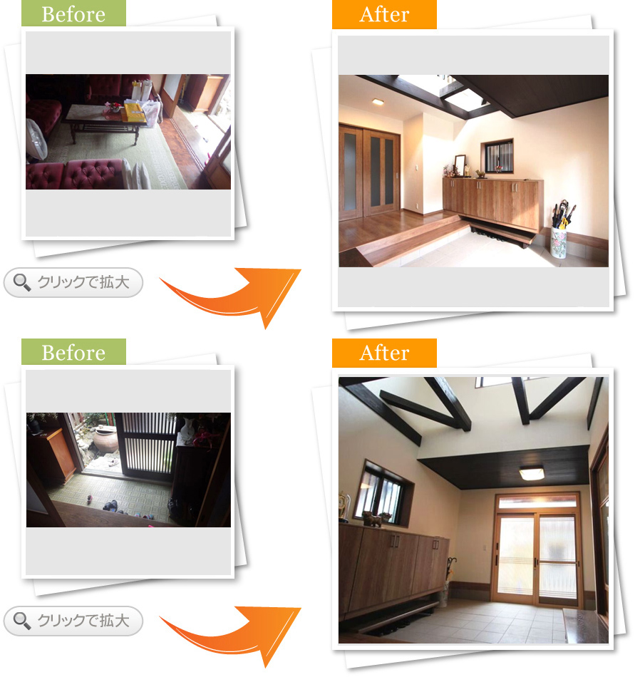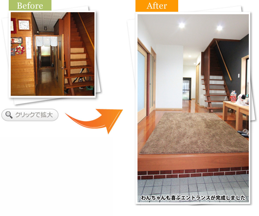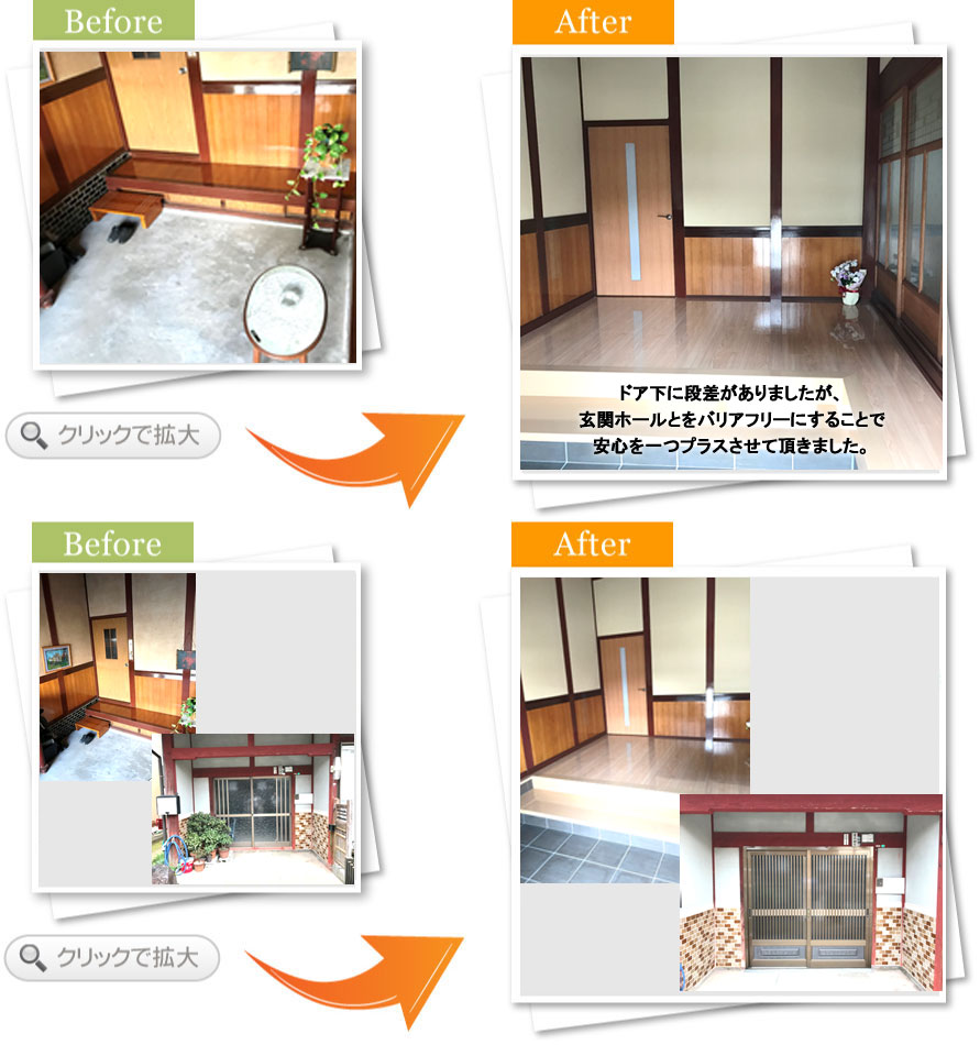 完了後アンケート玄関でお客さんと過ごす時間が多く、もっと居心地の良い空間にしたいと思い相談しました。床や壁の色が明るくなって、お客さんを呼ぶのが楽しみになりました。段差も少なくなり、安全面も満足しています。また何かあればお願いします