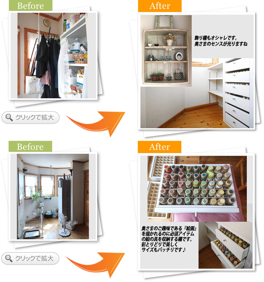 可動式のドアの取り付けもしっかりして下さって、お部屋の雰囲気も変化してとても幸せを感じています。ありがとうございました。