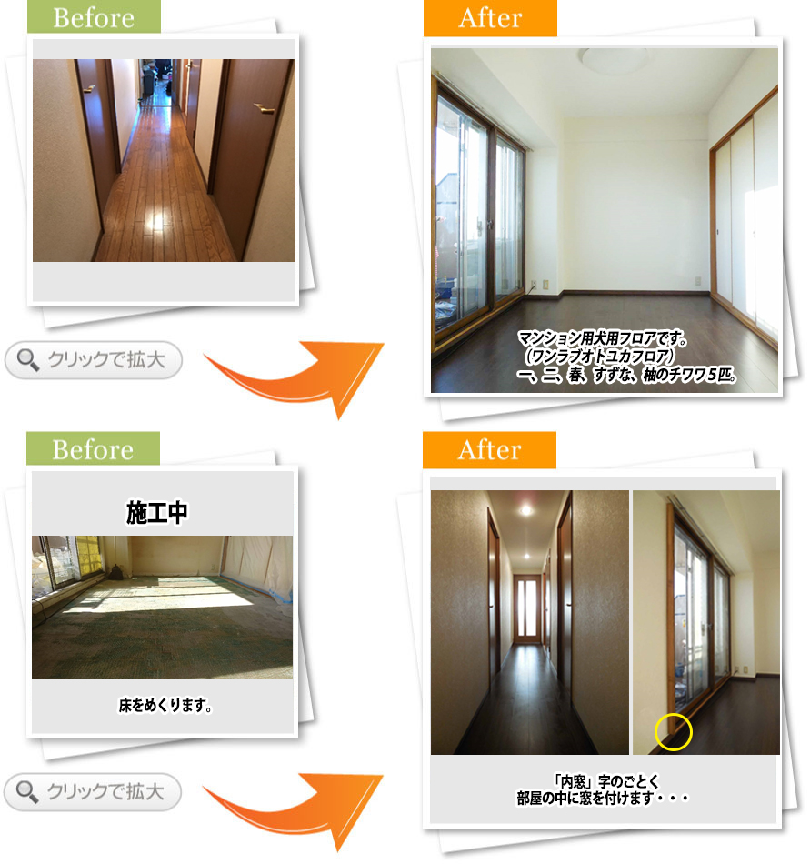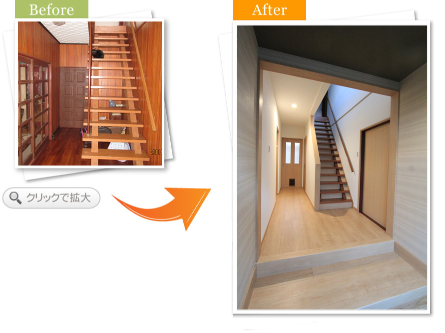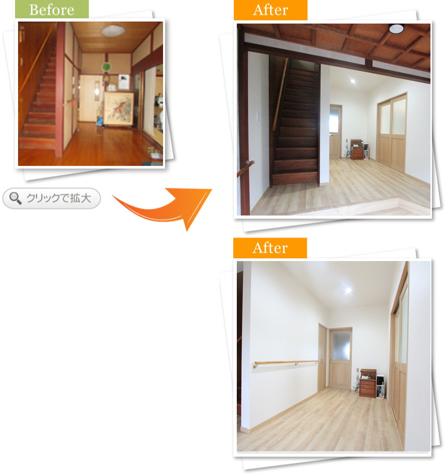 完了後アンケート内装の工事をする中で廊下の工事もお願いしました。廊下が狭く、物を置くとさらに狭くなってしまい不便に感じておりました。廊下を一度解体して、拡張する工事をお願いしました。工事後は物を置いても十分な広さがあるためとても満足しております。