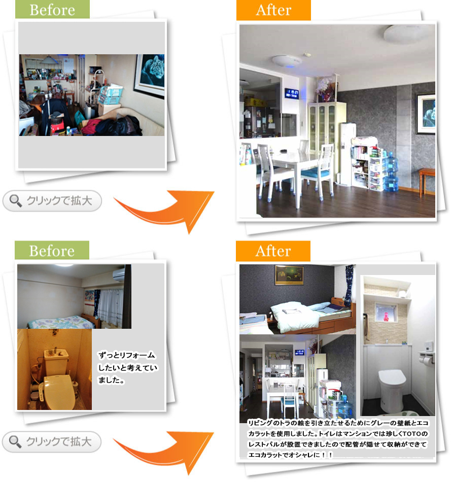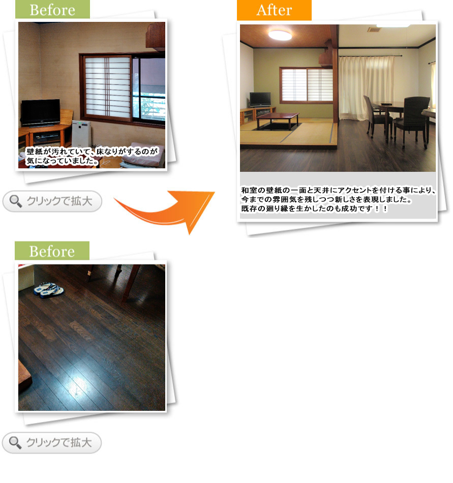 完了後アンケートLDKと廊下の床と壁が劣化をしてきたので、そろそろ貼り替えたいと思っていました。菱田さんは当マンションでイベントを開催していたり、実績もあるので依頼しました。色々と悩む私にアドバイスを下さり、オシャレな空間へと生まれ変わり満足しています。本当にありがとうございました。