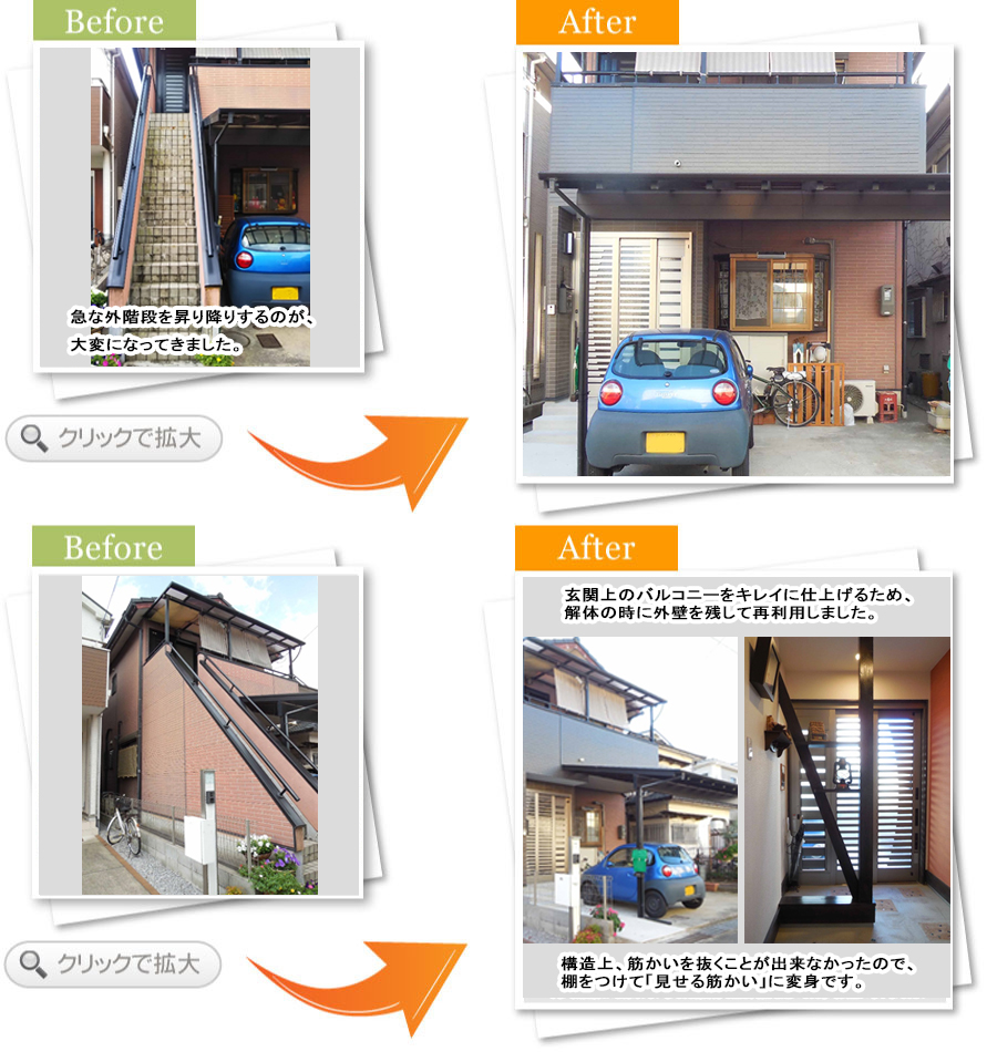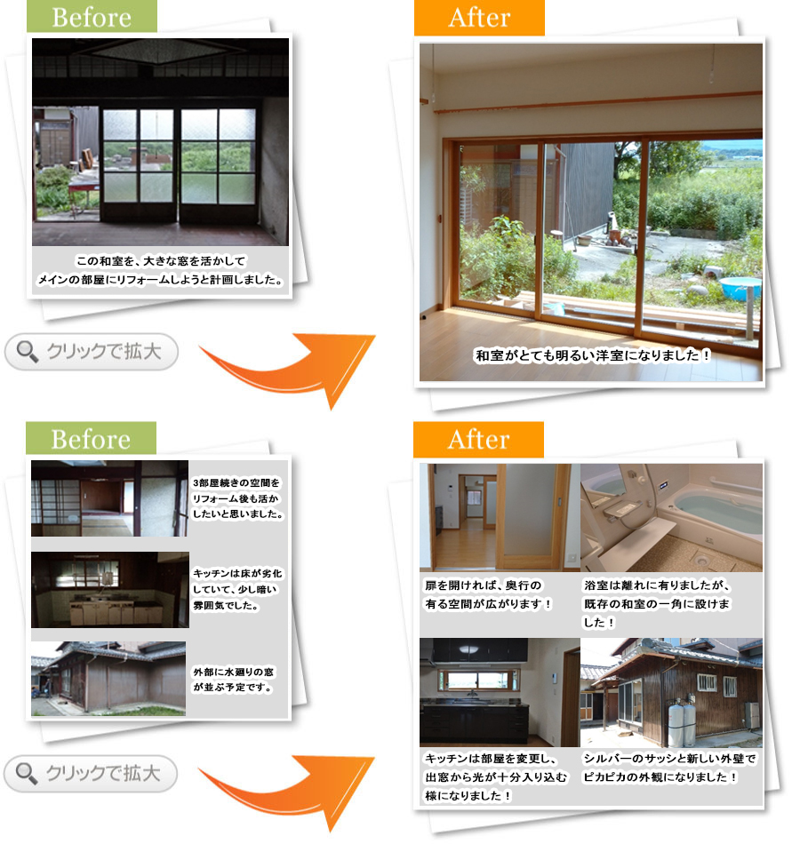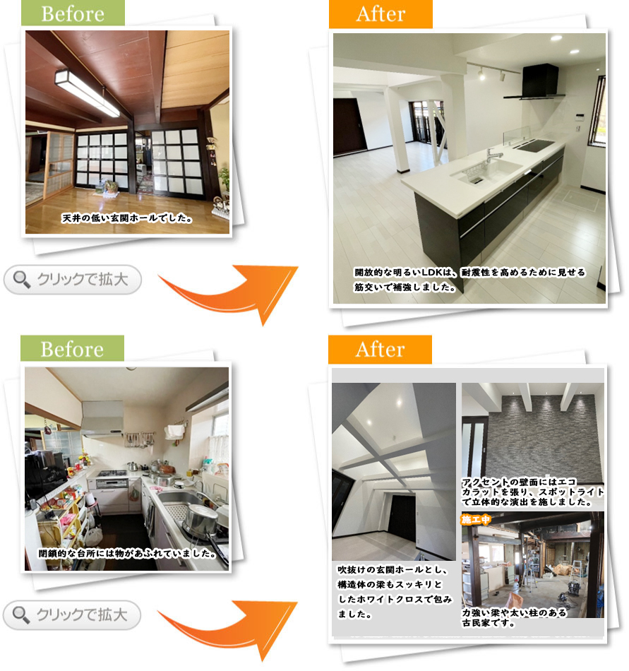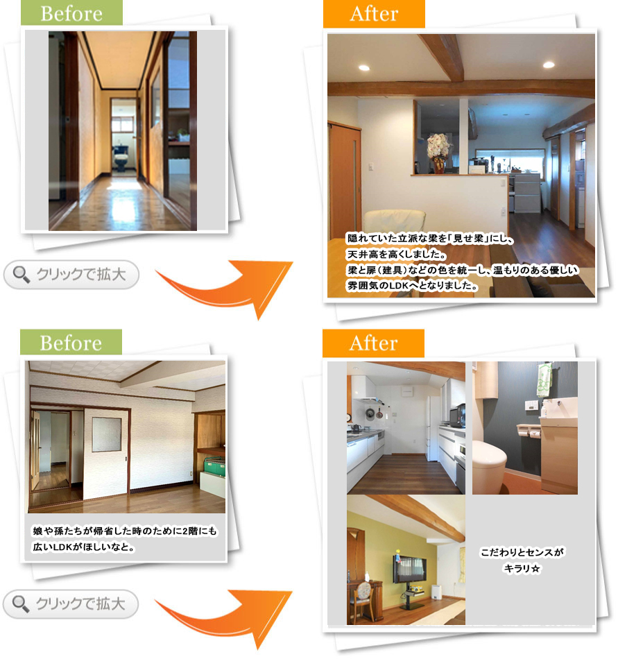 完了後アンケートこの度は山本さんに大変おせわになりました。私達のざっくりとしたリフォームのイメージを形にして頂き、とても素敵な住まいになったと感激しています。今までの階段や天井は残して頂きながらも住みやすくして頂きました。本当にありがとうございました。