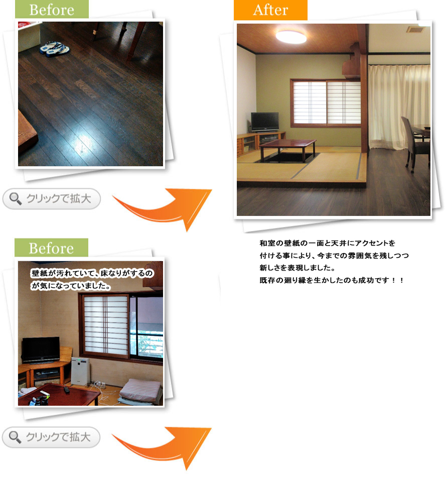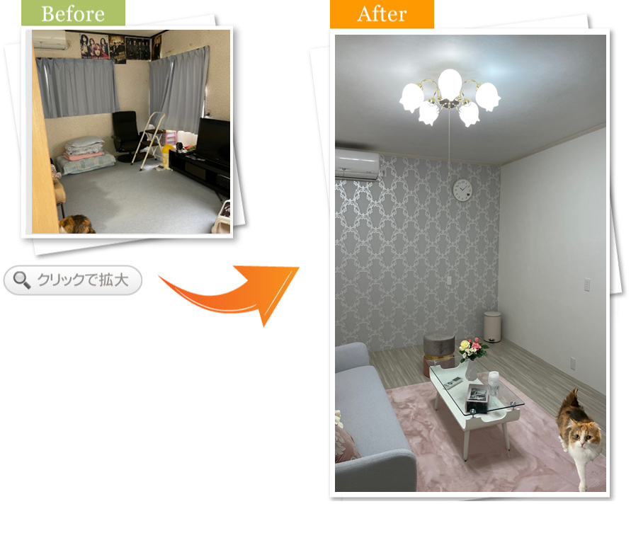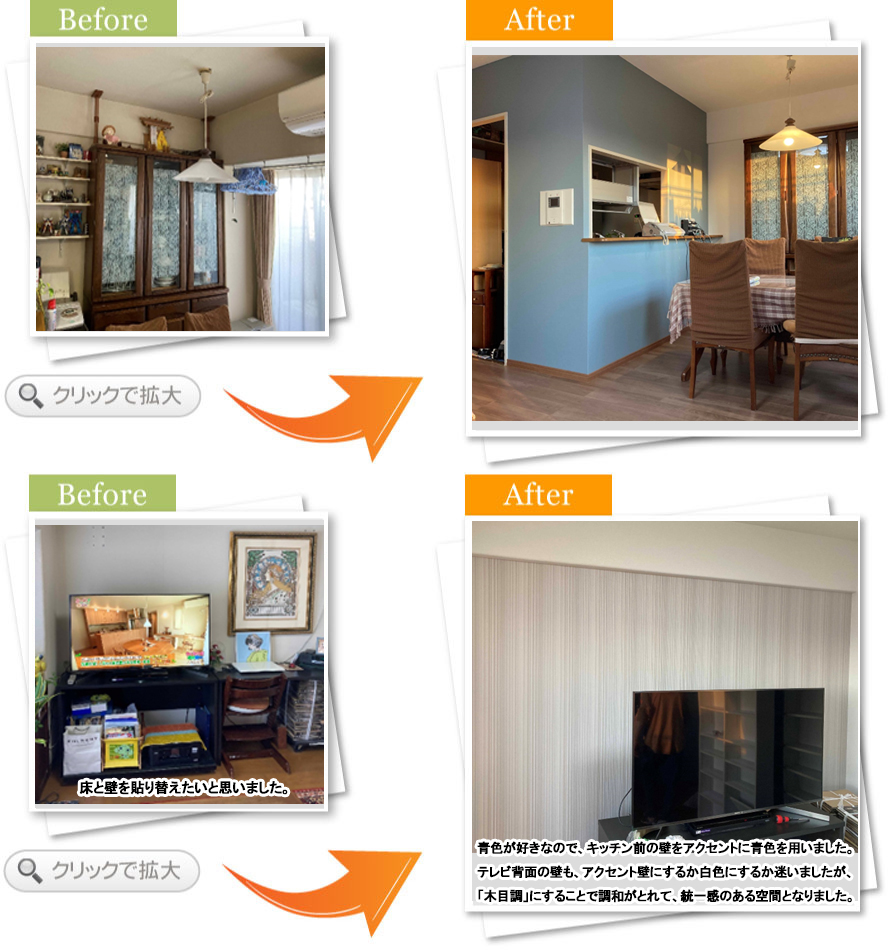 まずは、クロスの汚れが気になっていました。どうせ張り替えるなら、自分好みで居心地のいいモノにしたいと相談させていただきました。掃除もしやすく、オシャレな空間が出来て満足しております。