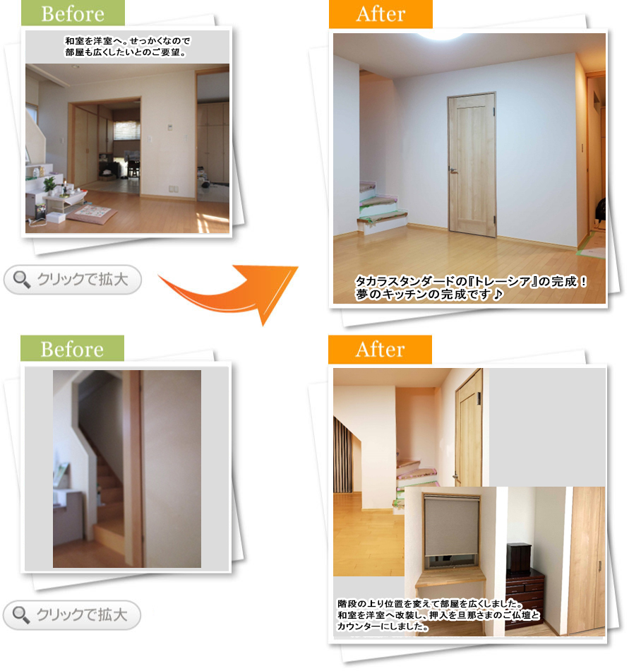 以前は、廊下を挟んで両脇に和室がありました。2世帯住宅工事と言う事で、2階でもLDKを確保したかったため、廊下をなくし、I型のキッチンを設けました。また、床には無垢のチーク材と輸入タイルを使用し、息子さんご夫婦たってのご希望によりカントリー調のお家に大変身しました。見た目だけでなく、木は心地の良い室内環境をつくる上で、欠かせない天然素材。プラス、珪藻土により、人に優しいお家になりました。。