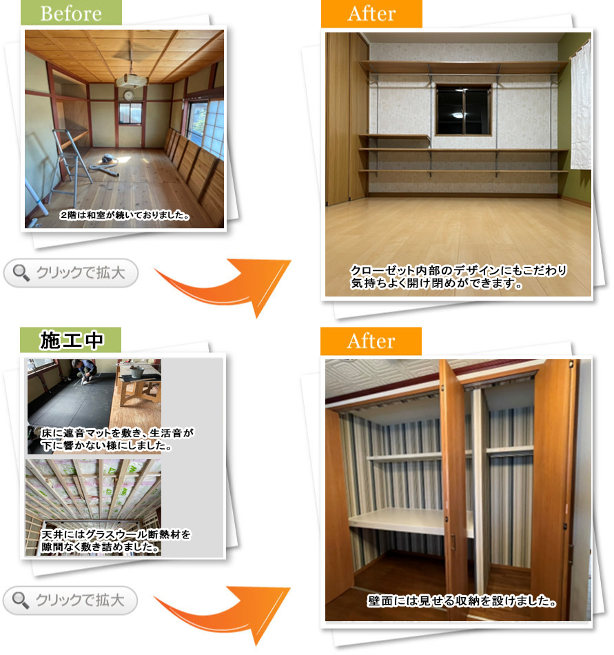床には遮音マットを敷き1階へ生活音が聞こえにくいように、そして天井には断熱材を敷き詰めて空調の効きもよくなりました。壁面には見せる収納を、クローゼット内部は扉を開け