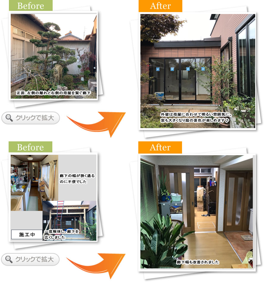 担当者コメント今回、母屋と離れを繋いでいる廊下を改装させて頂きました、既存の廊下は通過するスペースも十分ではなかった為、少し拡張するために一度解体して廊下自体を大きくしました。これで廊下にも色々な物も置け、尚且つ行き来がとてもしやすくなりました。外観も母屋の外観に合わせ、屋根も新しく板金屋根で仕上げました。