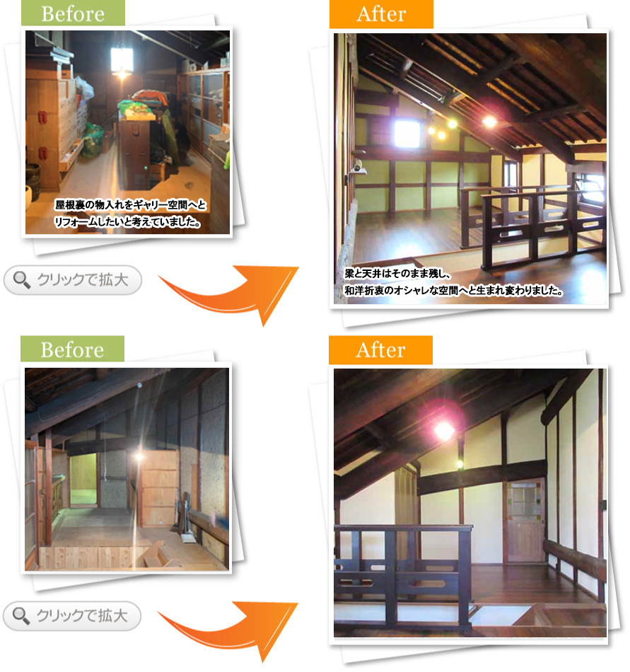 完了後アンケート外にも倉庫があるので、わざわざ屋根裏を物入れにするよりも居室へ改装して、器やお皿などを飾れるギャラリーにしたいと思い中嶋さんへお願いしました。手すりや扉などオーダーし思い通りの完成に満足しています。ありがとうございました♪