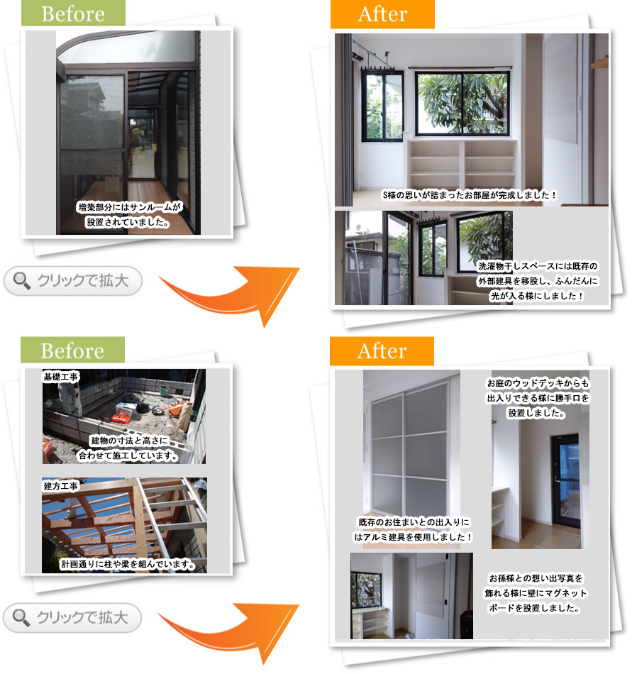 担当者コメント今回、S様の生活形態に合わせて、サンルームを撤去し木造で増築したいとご相談をいただきました。敷地の形状から、約6畳という空間をいかに便利にお使いいただくかのお打合せを重ねて間取りを考えました。増築という事で、工事中の防犯や雨漏り対策を考え、無駄のない工程で進めさせていただきました。S様のご趣味、くつろぎ空間、洗濯物干し、収納スペース・・・・・・、これから色々な目的でお使いいただければ、嬉しく思います!